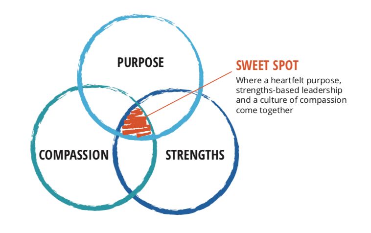 The practical question remains, how can organizations effectively implement strategies to promote and foster a culture of organizational happiness? Let’s take a look at The Organizational Happiness Sweet Spot which consists of three pillars: purpose, strength, and compassion. I wrote Organizational Happiness with an aim in mind of creating a real and unique competitive advantage for organizations - and to go beyond traditional strategic and management consulting “quick fixes” by creating sustainable results built on a fundamental focus of Purpose, Strengths and Compassion.